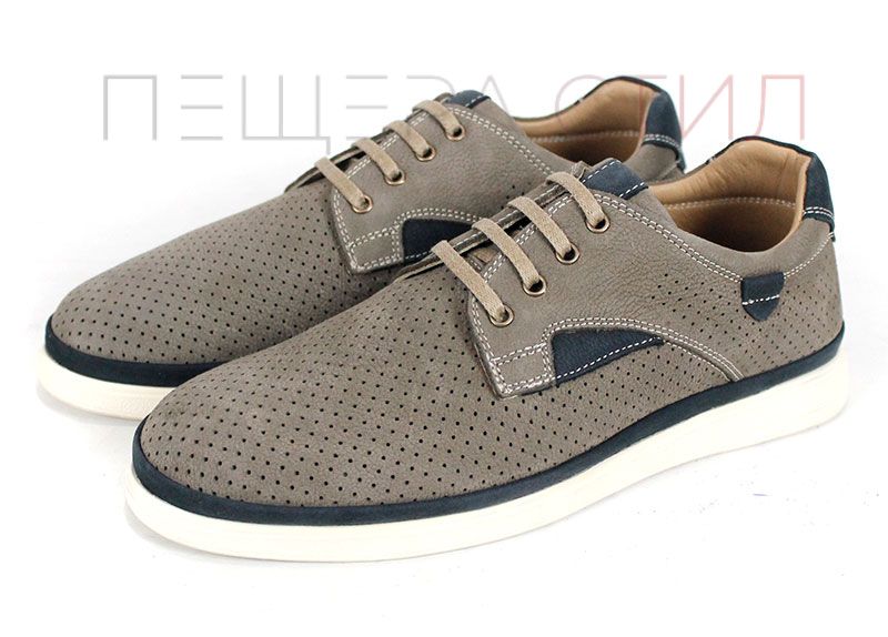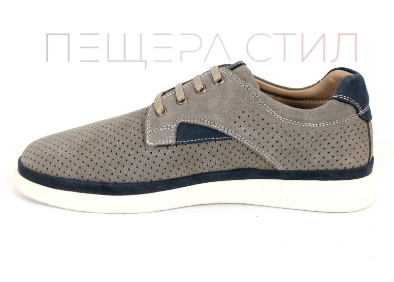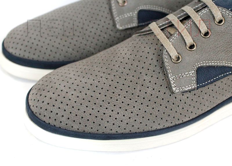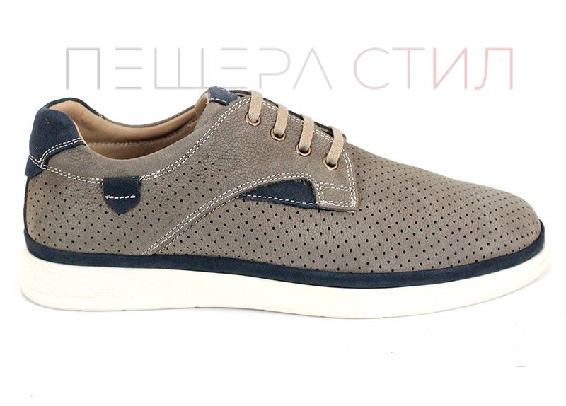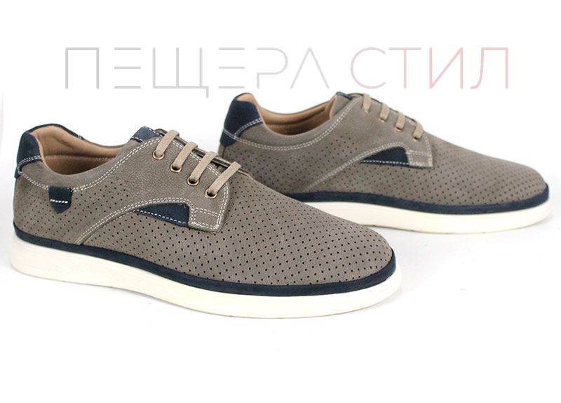 Urban Crest са мъжки летни обувки от естествен набук в сиво визонен цвят, с фина перфорация и контрастиращи тъмносини елементи, съчетаващи свежа визия, комфорт и лекота при ежедневно носене.