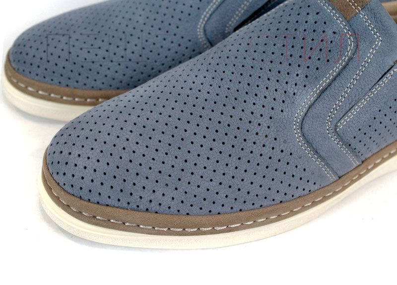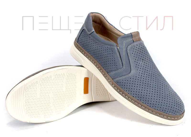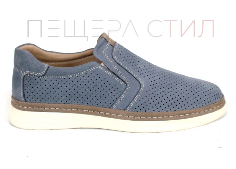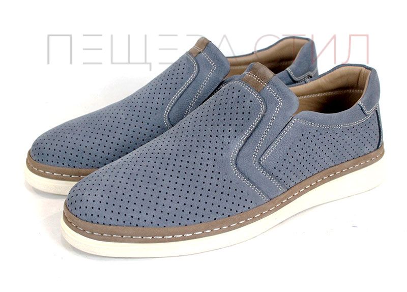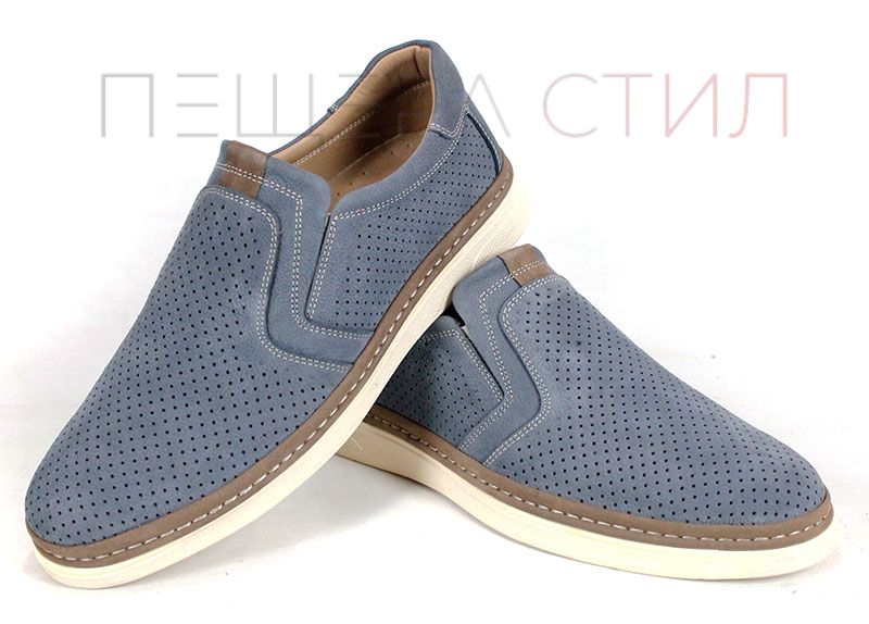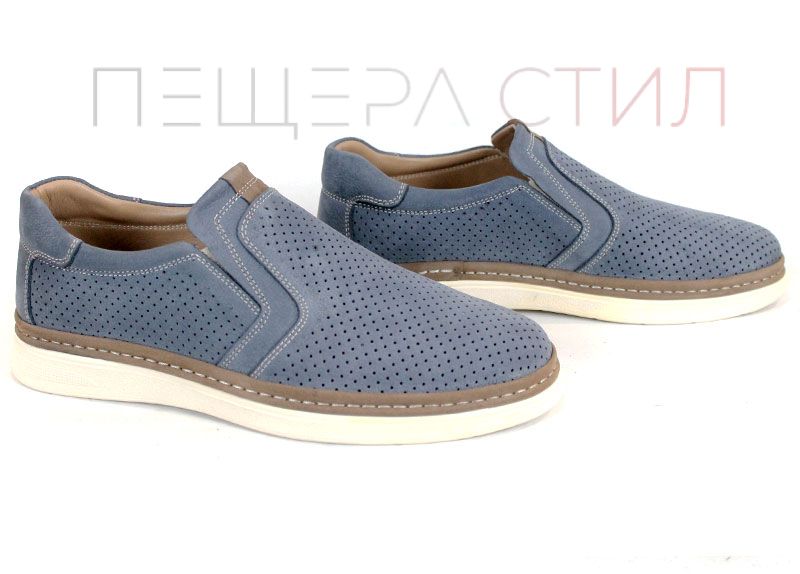 Ежедневни мъжки обувки без връзки, изработени от естествен набук в дънково син цвят, със ситна перфорация и еластични панели за лесно обуване. Леки, удобни и подходящи за продължително носене през лятото.