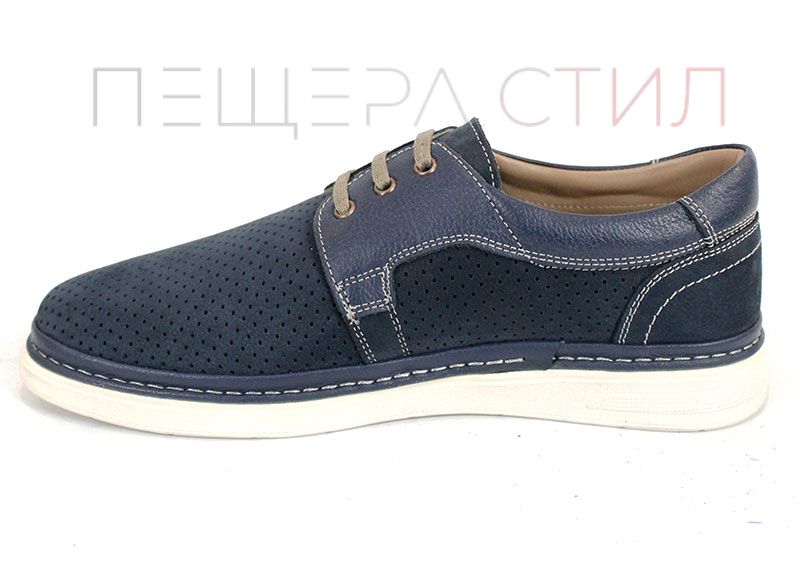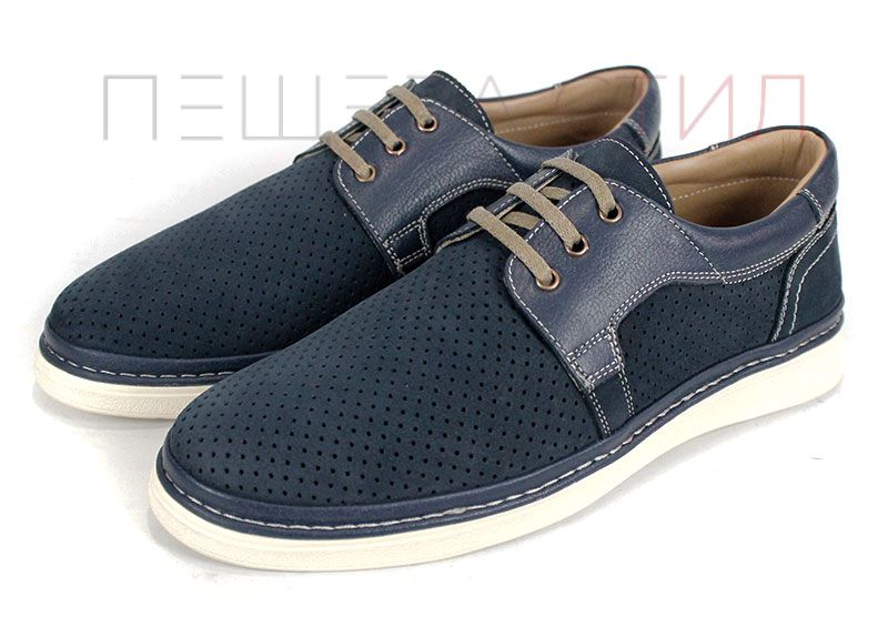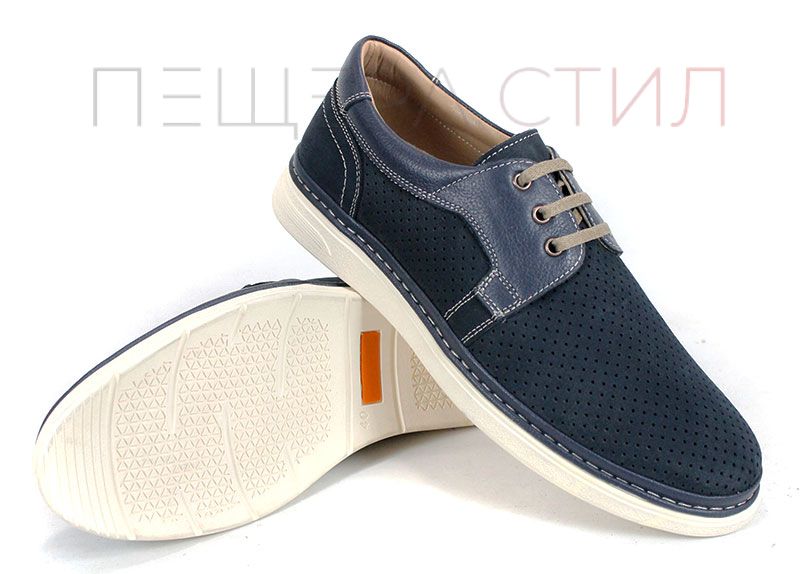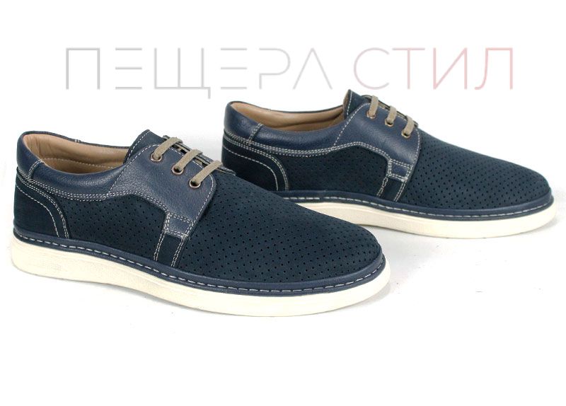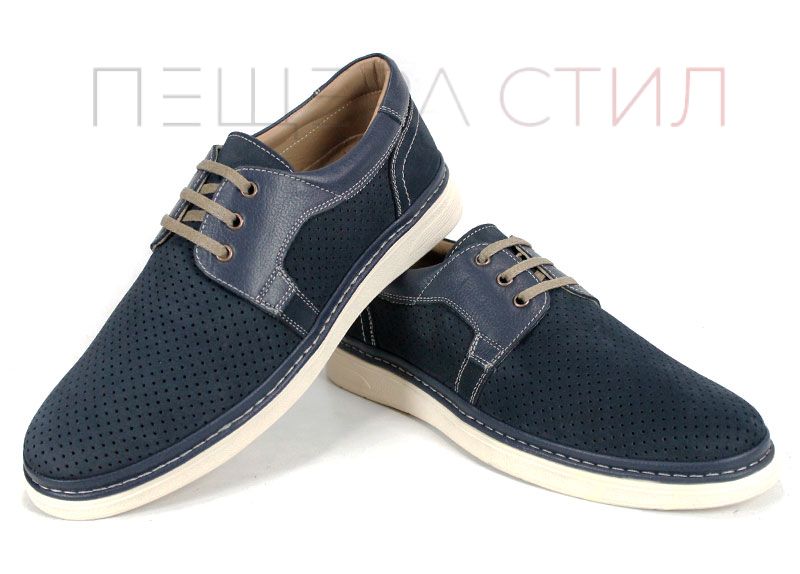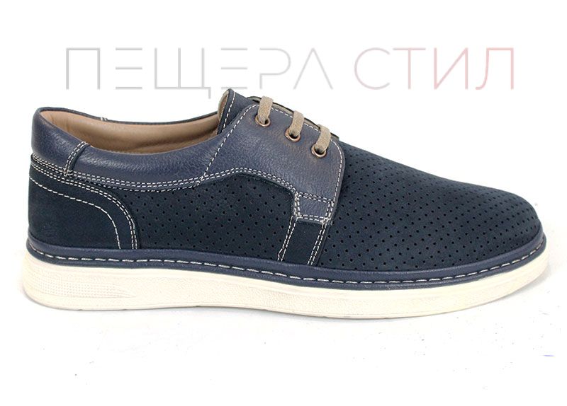 Леки и удобни мъжки летни обувки от перфориран естествен набук и елементи от гладка естествена кожа. Моделът е проектиран за комфорт при целодневно носене, с гъвкаво ходило в цвят слонова кост и изцяло кожена вътрешна част.