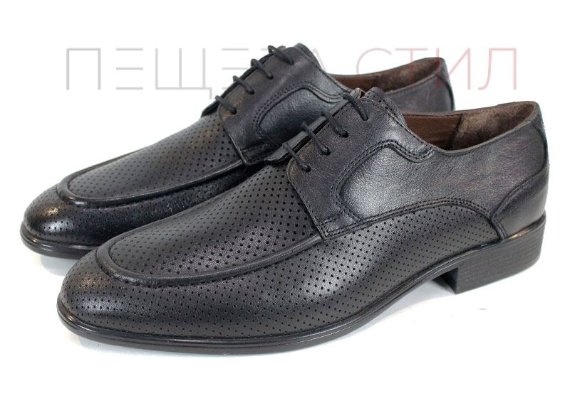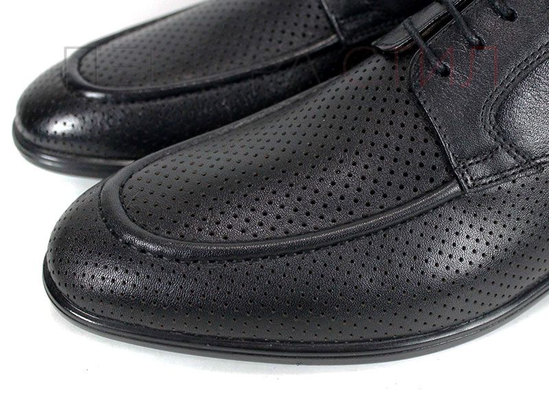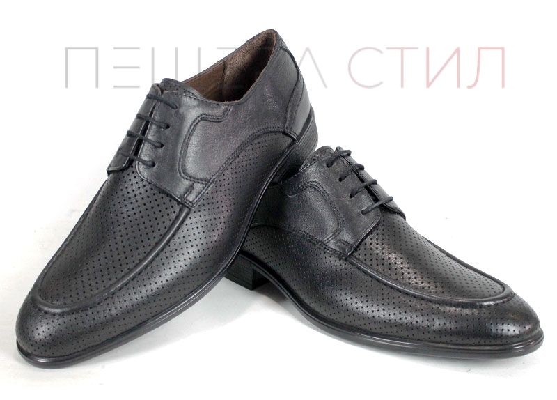 Мъжки официални обувки Lorenzo Forma, изработени от естествена черна кожа с фина перфорация, подходящи за по-топло време. Класически модел с връзки и елегантна лоуфър визия, с хастар и стелка от естествена кожа за комфорт през целия ден.