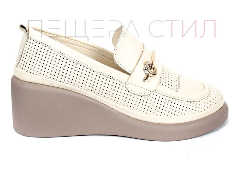 Олекотената клин платформа в тъмно бежов цвят придава елегантна линия и стабилна походка, без да натоварва стъпалото. Вътрешната част е изцяло от естествена кожа – както хастарът, така и стелката, което допринася за мекота, комфорт и добра адаптация към формата на крака.