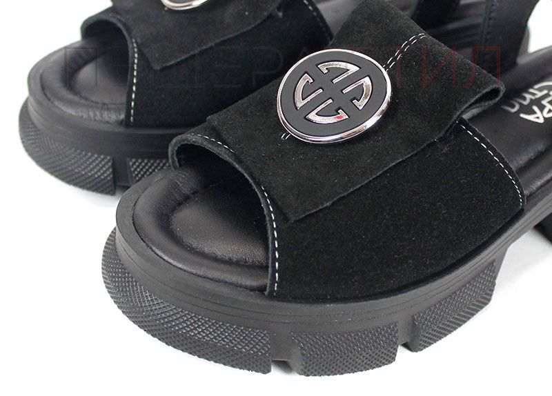 Горната част е изработена от естествен велур, който е мек на допир и същевременно устойчив при носене. Широката предна каишка осигурява стабилност на стъпалото, а металният декоративен елемент добавя завършен и разпознаваем стил.