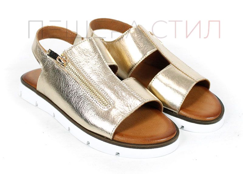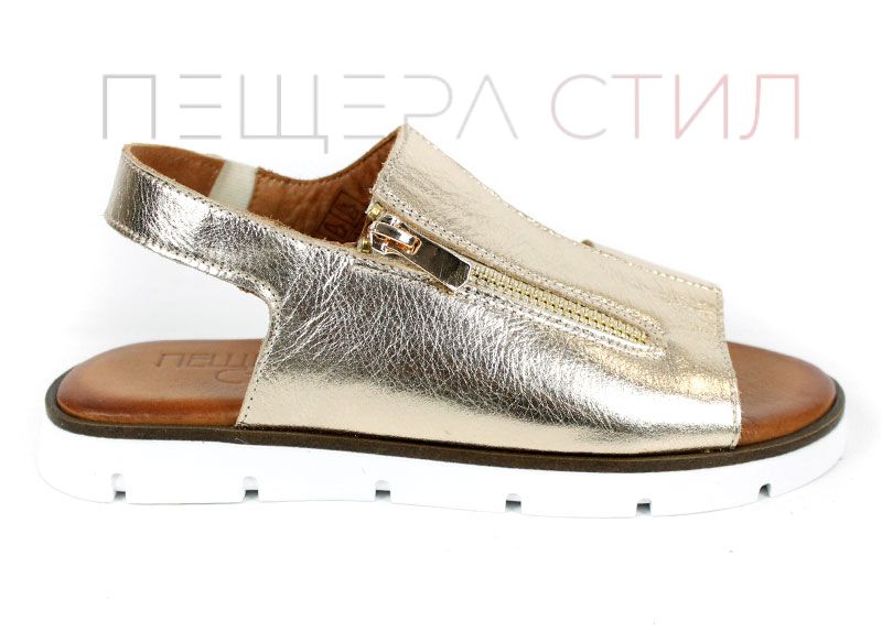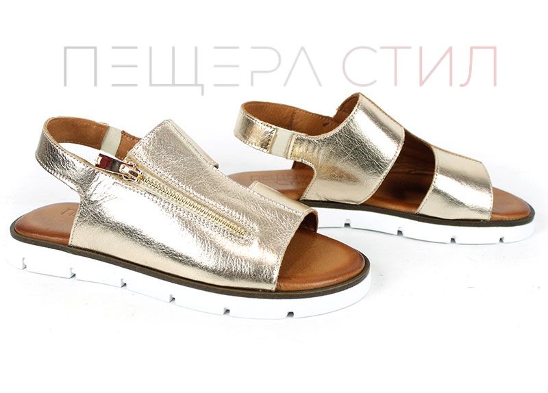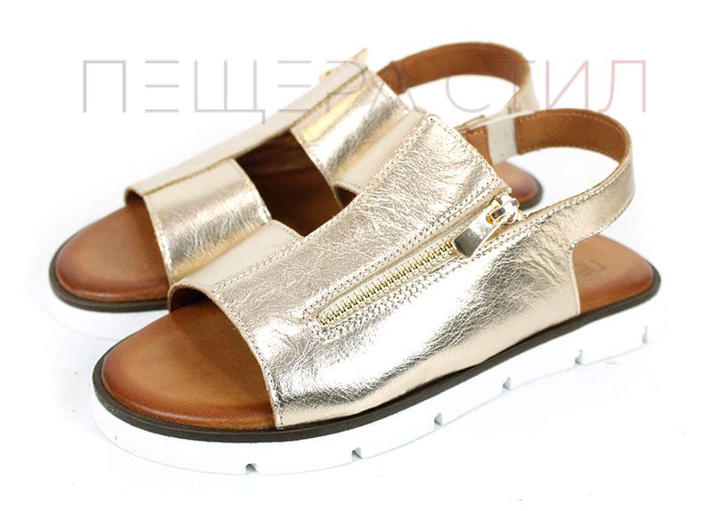 Изработени от висококачествена естествена кожа с ефектен златист завършек, тези сандали създават усещане за лекота и елегантност още при първото обуване. Дизайнът е изчистен, но акцентиран чрез металния цип отпред – детайл, който не е просто декоративен, а придава индивидуалност и модерно излъчване.