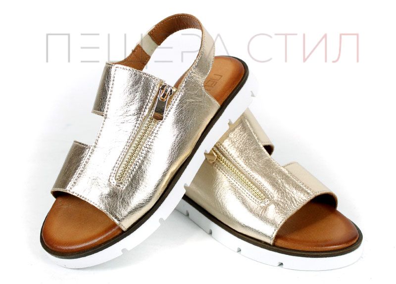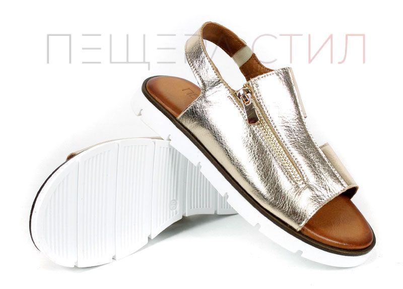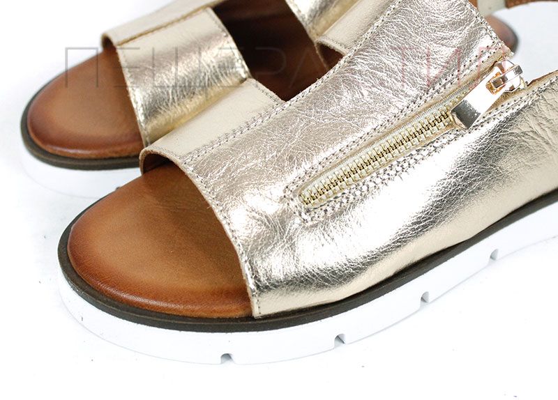 Viva Línea са дамски летни сандали от естествена кожа в златист цвят, създадени за комфорт и стил в ежедневието. Моделът е с ниско ходило, мека стелка и модерен дизайн с декоративен цип отпред.