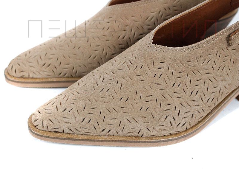 Горната част е изработена от висококачествен естествен велур в цвят канела – топъл, наситен и много търсен нюанс. Фината перфорация не е само декоративна, а осигурява отлична вентилация, което прави модела подходящ за по-топлите дни.