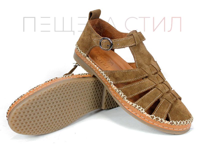 Горната част е изработена от естествен велур – мек, гъвкав и приятен при допир. Конструкцията с отворени елементи позволява на крака да „диша“, което е ключово при високи температури.