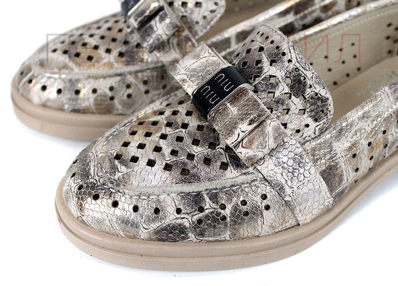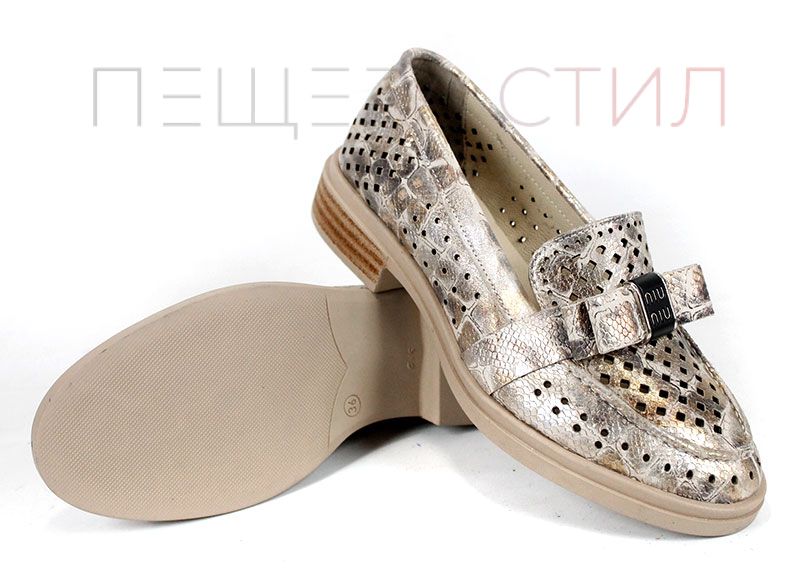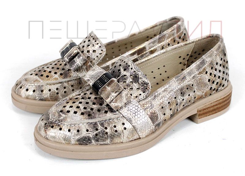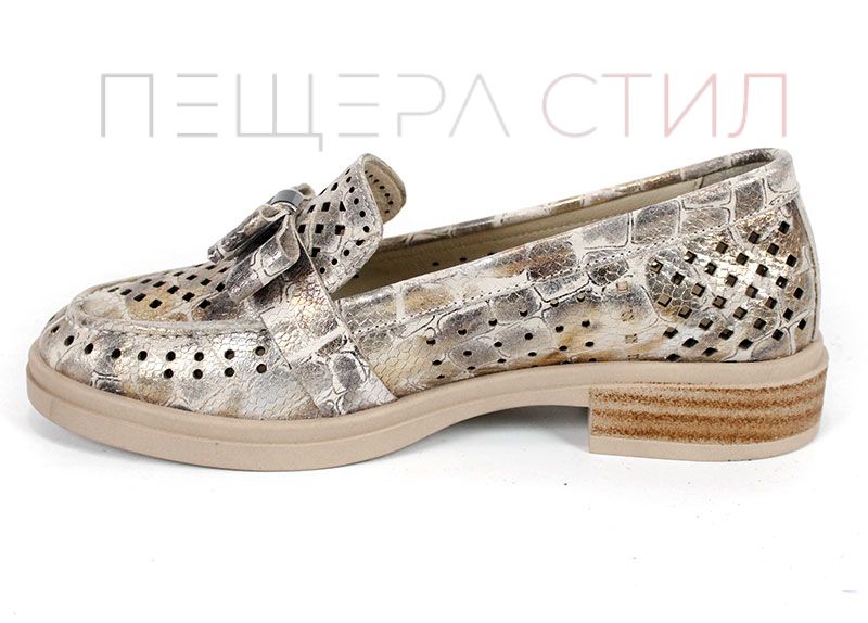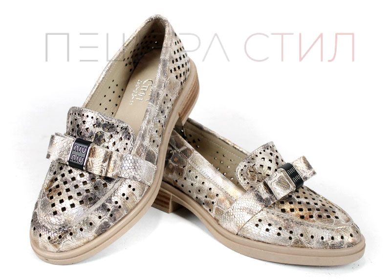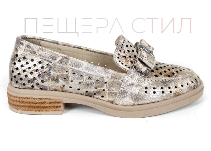 Елегантен дамски модел от естествена кожа с перфорация, комбиниращ визон нюанс, кроко текстура и деликатен златист отблясък. Създаден за комфорт и стил през топлите дни, с олекотена подметка и стабилен нисък ток.