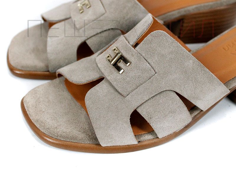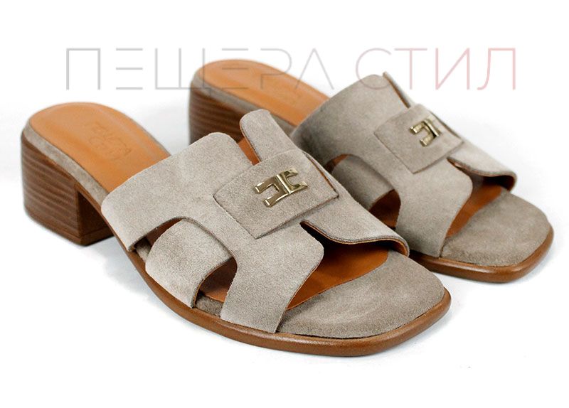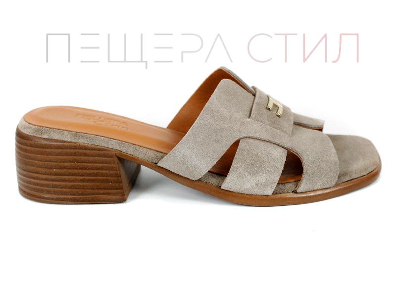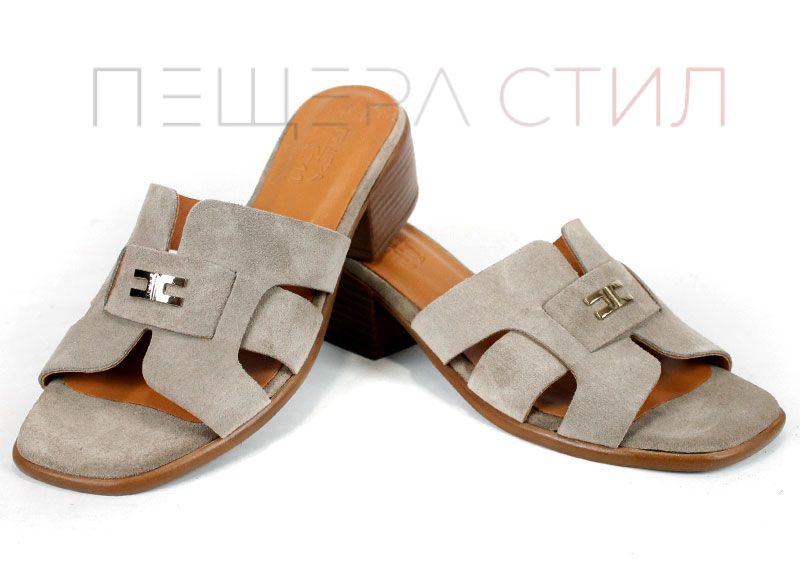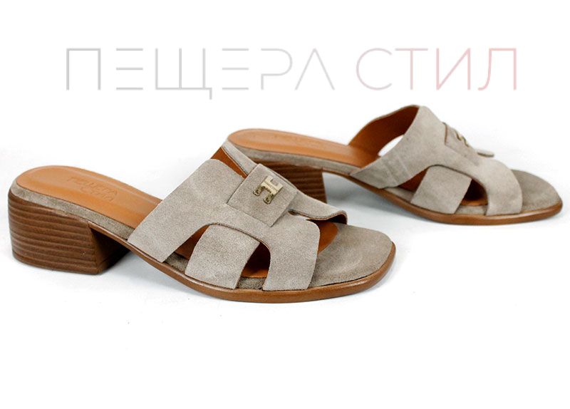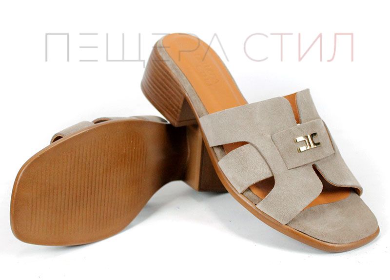 Естественият велур в цвят визон (пясъчно кафяво) е една от най-продаваемите гами – неутрален, лесен за комбиниране и визуално „скъп“. Кръстосаните каишки осигуряват стабилност на стъпалото, без да притискат.