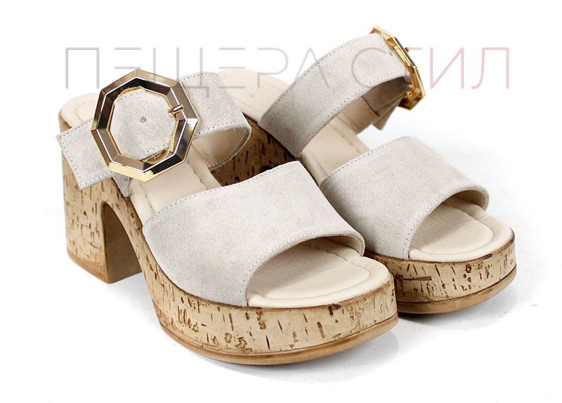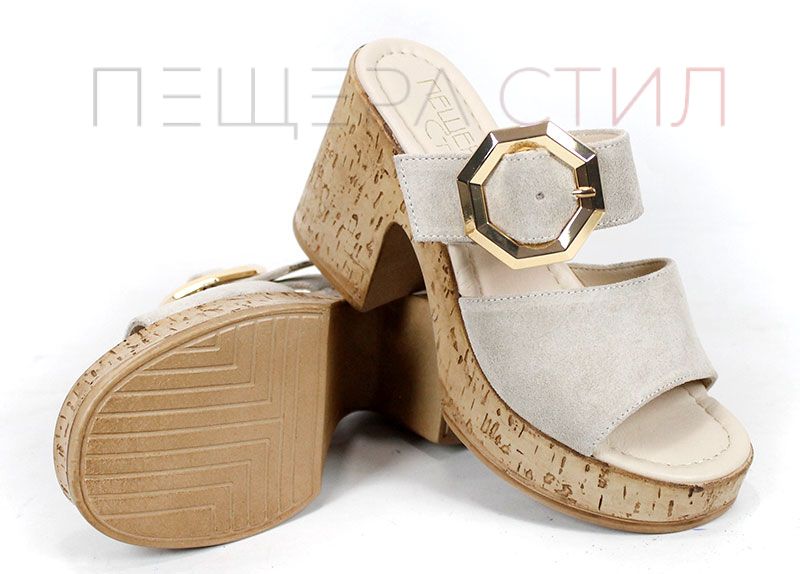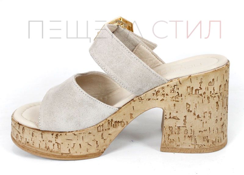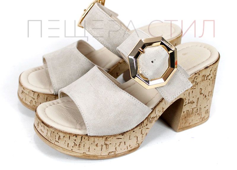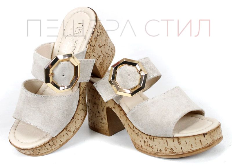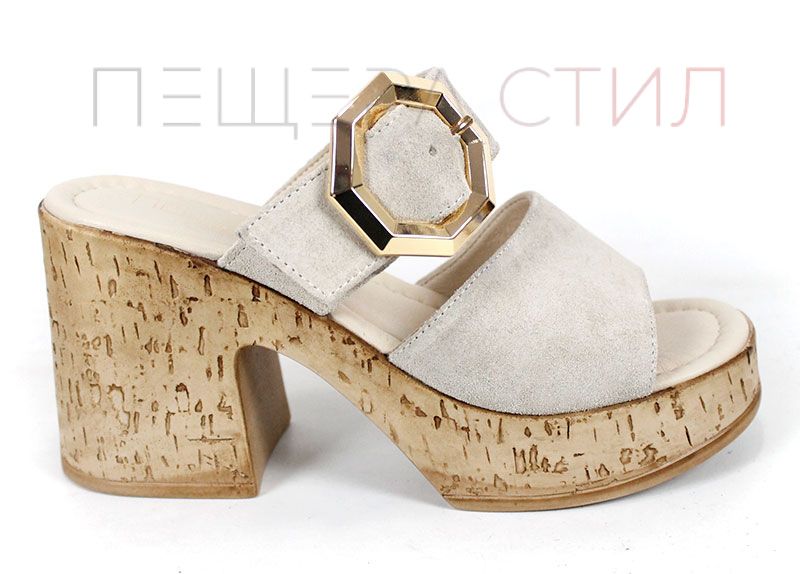 Елегантни дамски чехли от естествен велур в нежен бежов нюанс, с масивна платформа и акцентна златиста катарама – стил и комфорт в едно.