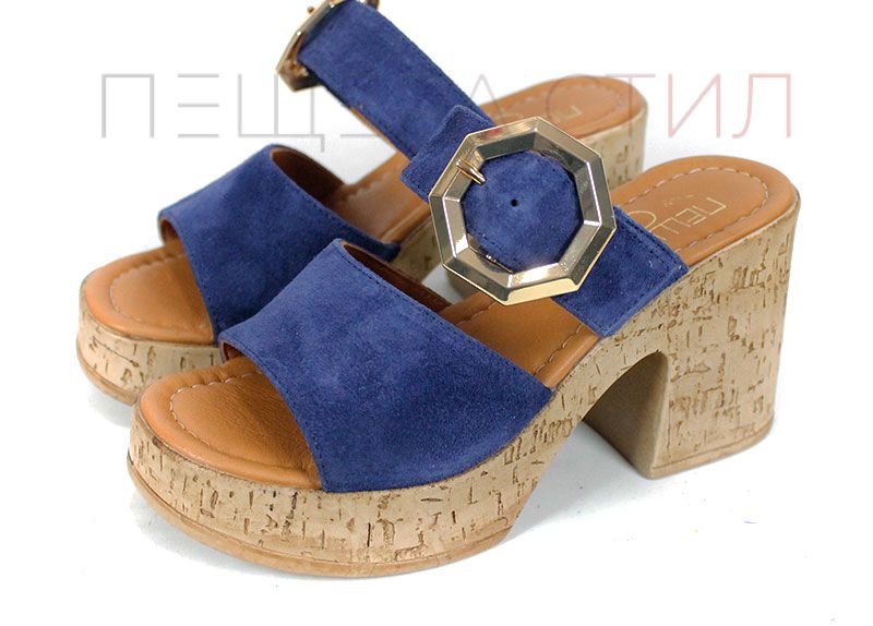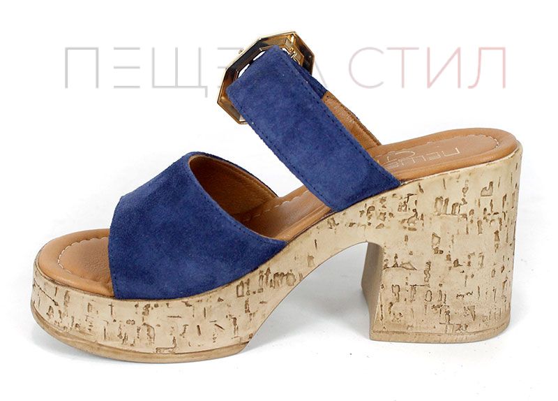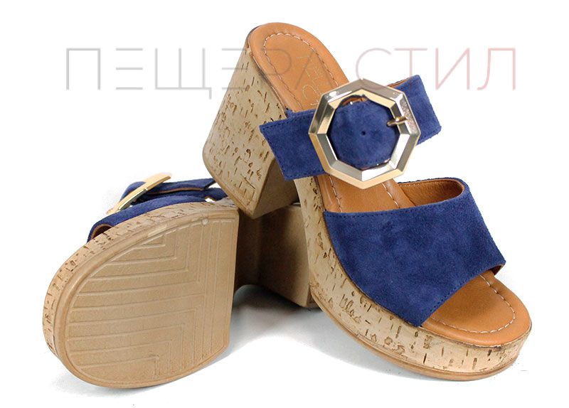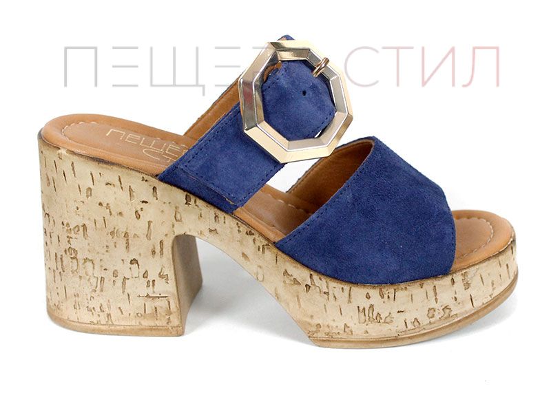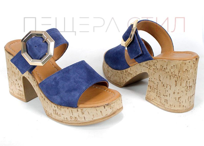 Стилни дамски чехли от естествен велур в наситено син цвят, с масивна платформа и ефектна златиста катарама – отличителна визия и стабилен комфорт.