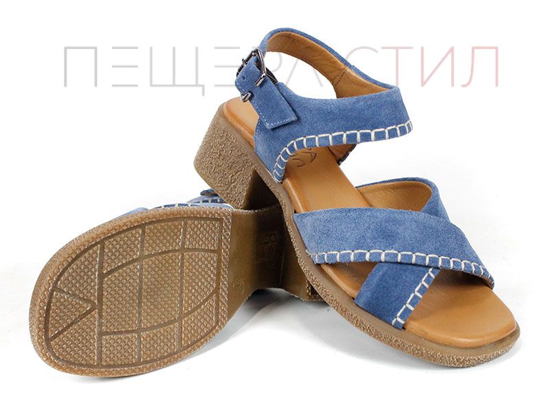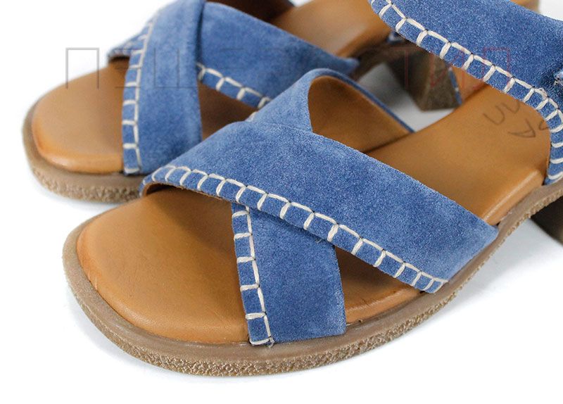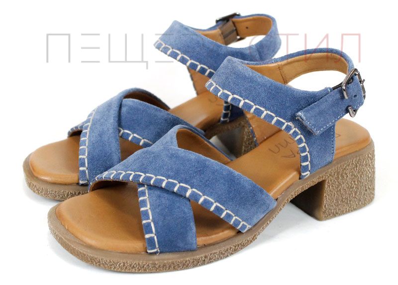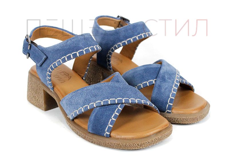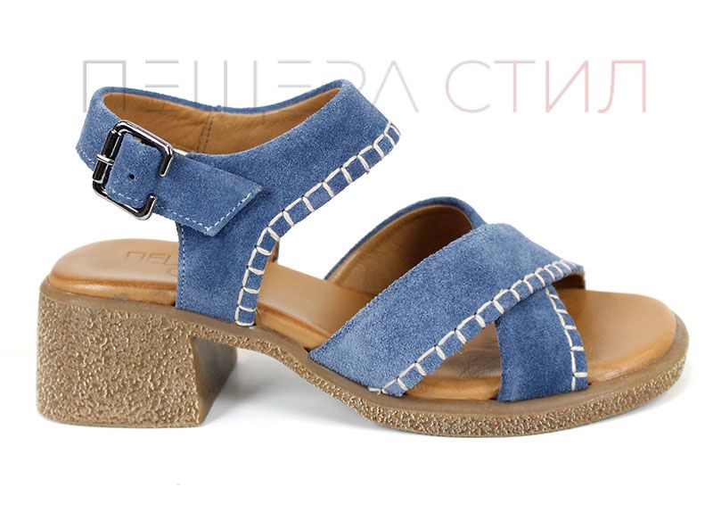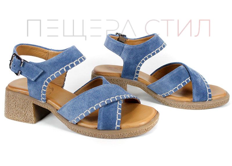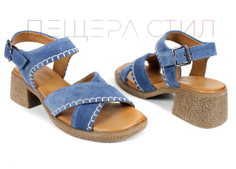 Дамски сандали от естествен велур в наситен син цвят, създадени за комфорт и стил през летните дни. Моделът се отличава с мека текстура, стабилен ток и характерни декоративни шевове, които придават по-небрежна, но добре завършена визия. Перфектен избор за ежедневие, разходки и градска среда, когато търсиш удобство с лек акцент.